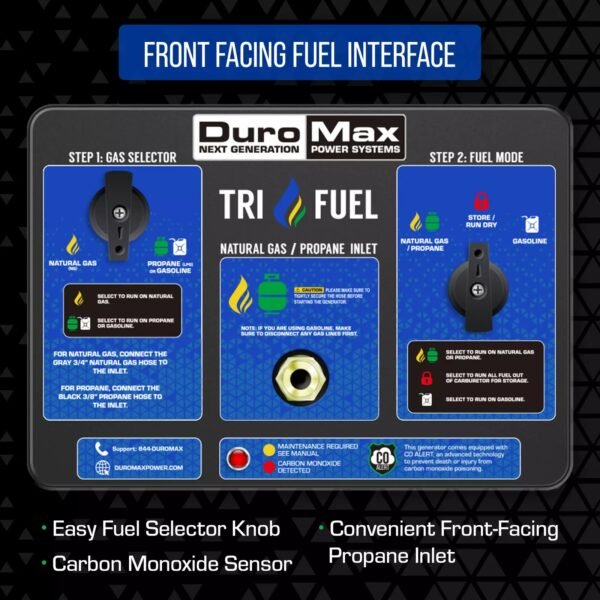 • Front-Facing Fuel Interface: Switch between fuel types easily and effortlessly with our front facing fuel interface, now with quick connects. The flexible fuel line allows you to hook up your generator to propane tanks of all sizes, while the long, oversized 3/4 in. 5 meter hose will easily accommodate your generator and gas line setup.